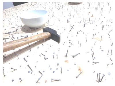 Exposition Yoko Ono Lumière de L’aube au MAC Lyon, salle de conseil d’administration, Painting to Hammer a Nail, en référence à la rencontre entre John Lennon et Yoko Ono en 1966 (John voulut planter un clou dans un tableau de Yoko).